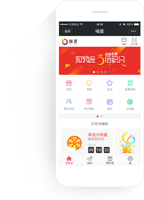集团模式,一云多端,大会员体系,大积分体系,卡券体系,营销体系,排队领号,停车缴费,叫餐预定,智能WIFI,室内地图,现场互动,积分商城等。